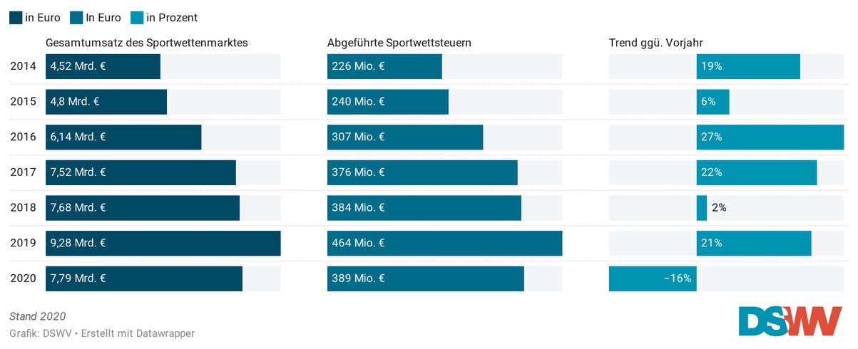 Berlin. - Der Sportwettenmarkt in Deutschland ist im Coronajahr 2020 stark eingebrochen. Dies geht aus den Sportwettsteuerzahlen des Bundesfinanzministeriums hervor. Die Gesamtumsätze lagen bei 7,8 Mrd. Euro und damit rund 16 Prozent unter dem Rekordwert des Jahres 2019 (9,3 Mrd. Euro) - das entspricht abgeführten Sportwettsteuern in Höhe von 389 Mio. Euro (2019: 464 Mio. Euro). Ohne Berücksichtigung der Vorkrisenmonate Januar und Februar fällt der Einbruch noch deutlicher aus (- 20 %). Als Gründe für die Umsatzrückgänge nannte der Deutsche Sportwettenverband (DSWV) auf seiner heutigen Jahres-Pressekonferenz ausgefallene Sportereignisse sowie Wettbüroschließungen im Lockdown.